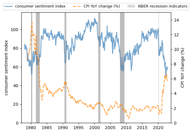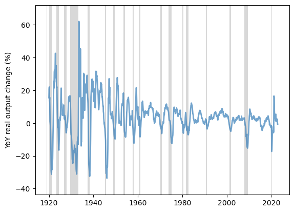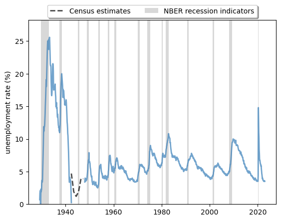 Let’s plot the unemployment rate in the US from 1929 to 2022 with recessions defined by the NBER.