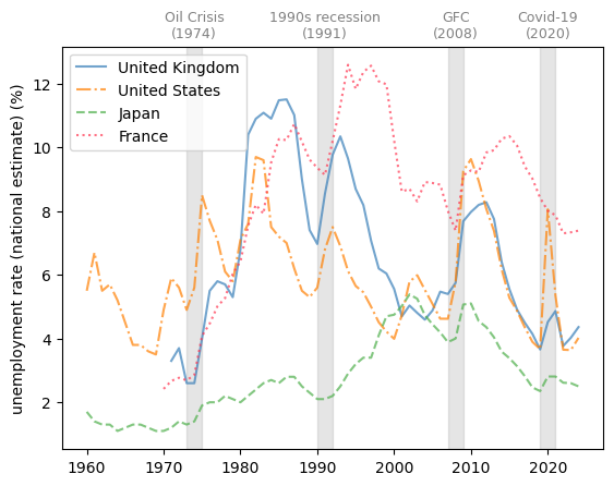 Here we compare the unemployment rate of the United States, the United Kingdom, Japan, and France.