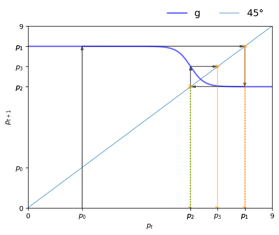 Let’s try to understand how prices will evolve using a 45-degree diagram, which is a tool for studying one-dimensional dynamics.