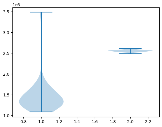 Here is the code that generates the two samples, produces the violin plot and prints the mean and standard deviation of the two samples.