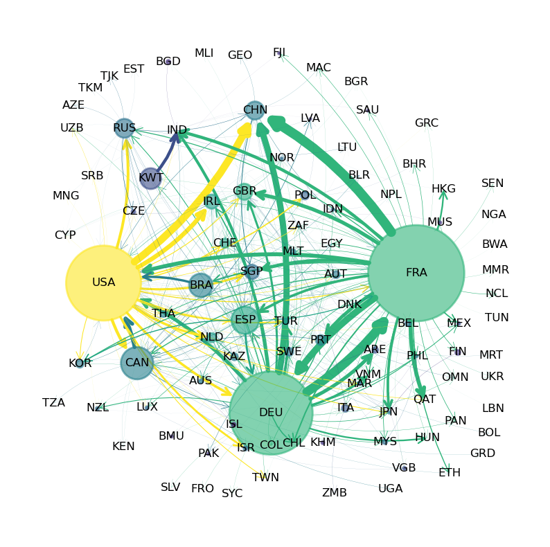 The following figure shows international trade in large commercial aircraft in 2019 based on International Trade Data SITC Revision 2.