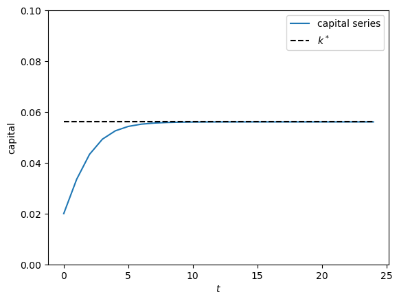 The 45-degree diagram above shows that time series of capital with positive initial conditions converge to this steady state.
