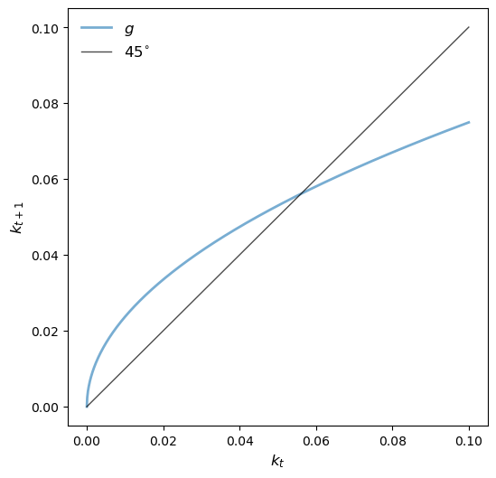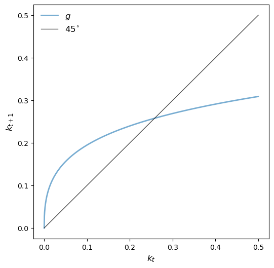 ax.plot(k_grid, k_grid, 'k-', lw=1, alpha=0.7, label=r'$45^{\circ}$')